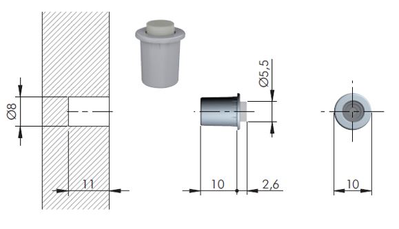 vnějším měkkým tlumičem Pro otvor 8 mm, zahloubení 11mm. Venkovní rozměr 10mm, přesah 2,6 mm. Odkaz na stránky dodavatele.